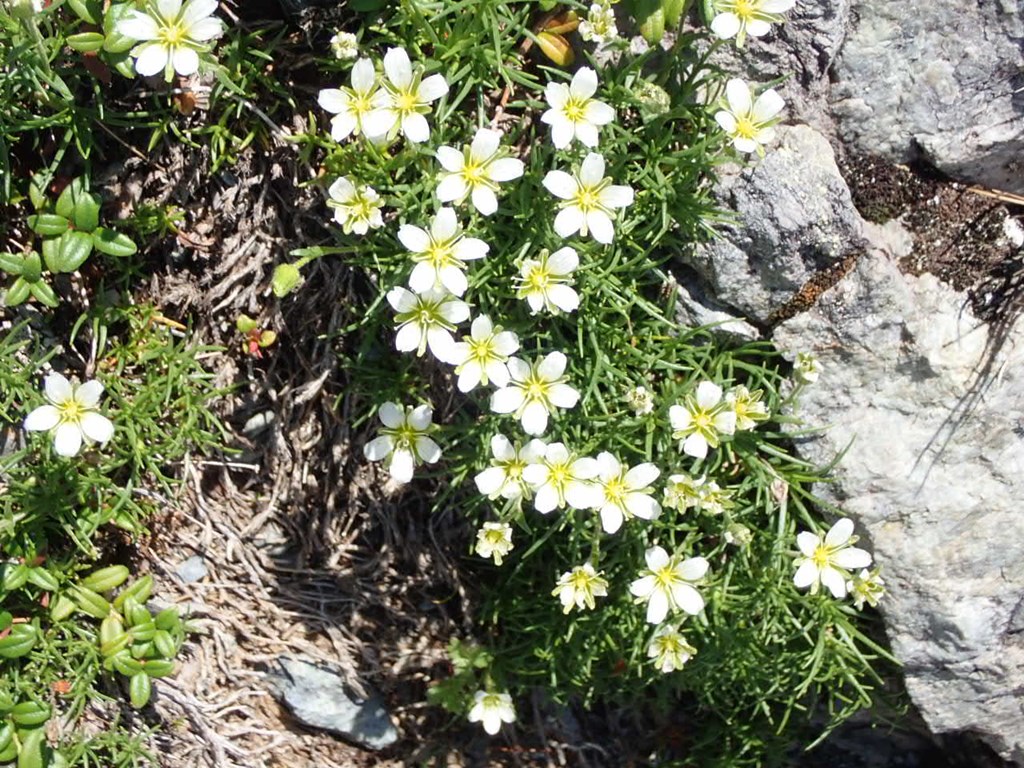 タカネツメクサ 白系 2021.05.062024.08.11 (ナデシコ科)(花色:白色)(季節)(特徴)花:直径約1cmで枝先に1個咲く。花弁の先に細かい鋸歯がある。花弁の間にガクが見える葉:針形で長さ8-15mm(付記) 2019.8.5 白馬岳