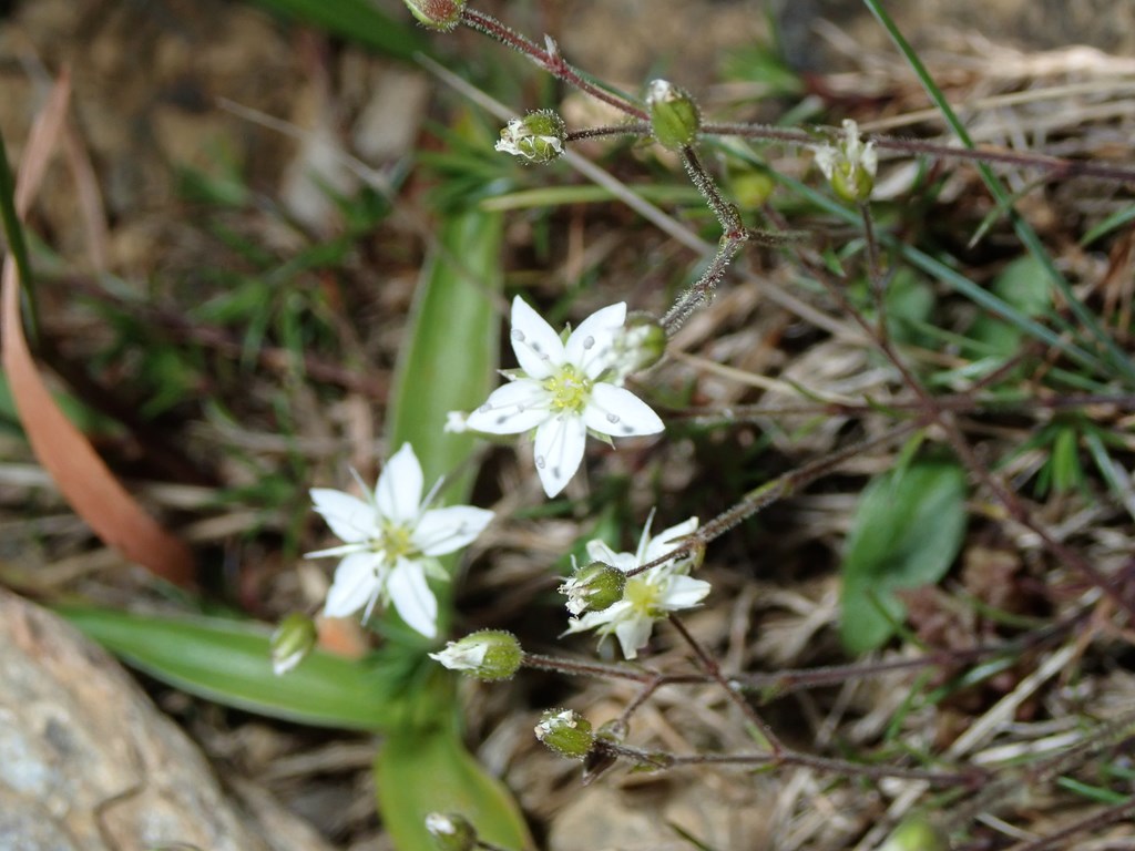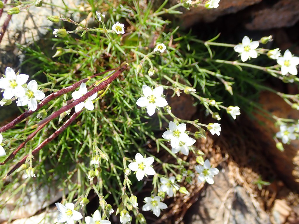 ホソバツメクサ 白系 2021.05.062024.08.11 (ナデシコ科)(花色:白色)(季節)(特徴)花:直径5-6mm、枝先に数個咲く。雄しべの葯が紅色。葉:針状で長さ3-10mm(付記)花弁の間にガクが見えるのと、葉が細いのはタカネツメクサと同じ。花弁はタカネツメクサより太く三角形のように尖り気味。