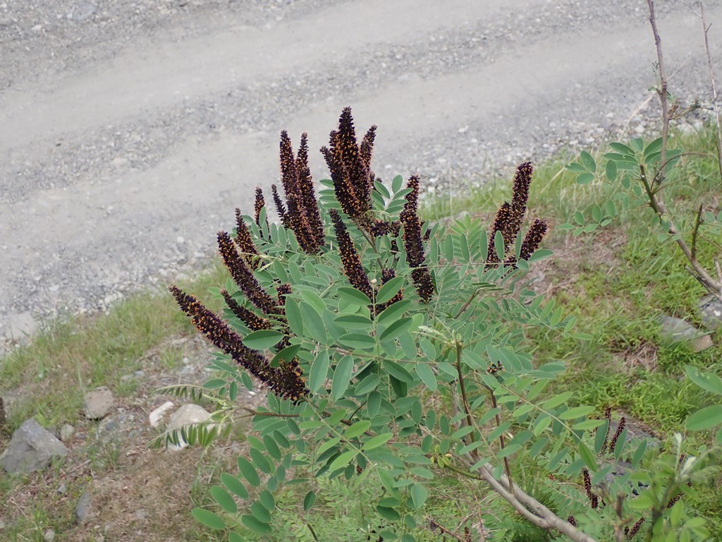 イタチハギ その他 2021.06.16 (マメ科)(花色:黒紫)(季節)(特徴)花期は4-7月で、長さ6-20cmの黒紫色をした穂状花序をつける(付記)根の土壌固定力が強いので、法面緑化に利用されている。 2021.6.12 社山南尾根取付下