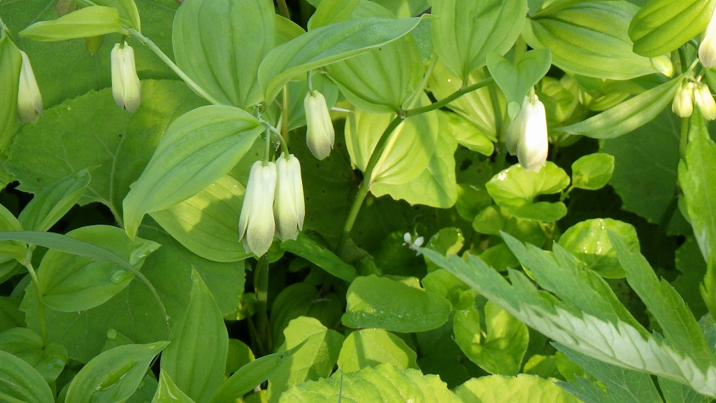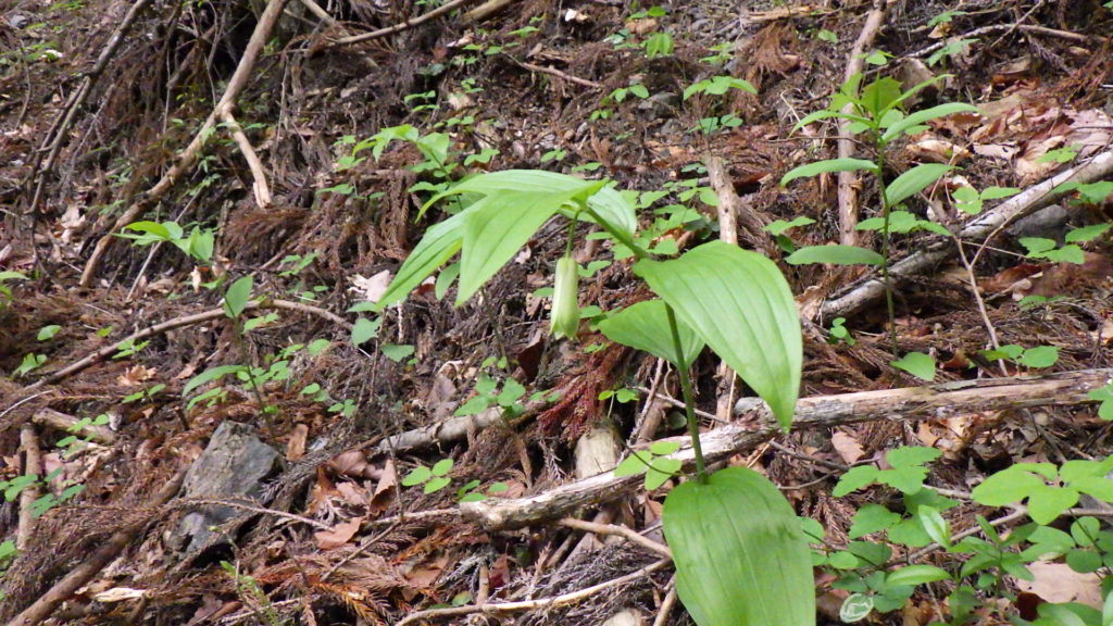 ホウチャクソウ 白系 2021.05.022021.06.20 (イヌサフラン科)(花色:白色)(季節)(特徴)花:枝に1~3個ぶら下がる。咲き始めは緑で、次第に白くなり、先端だけ緑が残る。花被片は6枚(3枚の花びらと3枚のガク)で合着しないが、チゴユリのようには開かないので筒状に見える。花被片が合着しない点で、よく似たアマドコロと見分けることができる。茎が上部で枝別れする(付記)分類はユリ目イヌサフラン科。 2017.6.24 浅草岳2016.5.2 鳴神山
