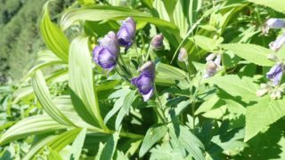 青系 ダイセツトリカブト (キンポウゲ科)(季節)8月(特徴)(付記)大雪山山には他にエゾホソバトリカブトがあり、違いは花柄と上萼片に開出毛と腺毛が生えるのが本種で、屈毛が生えるのがエゾホソバトリカブトである。2022.8.6 白雲岳避難小屋近く 2022.08.23 青系