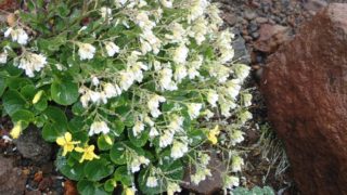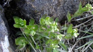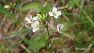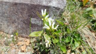 白系 ヤマハタザオ (アブラナ科)(花色:白色)(季節)(特徴)花:茎頂に総状花序を出す。花は白色、花弁は4枚。葉:根生葉はロゼット状、茎葉 は茎を抱き、ともに波状の鋸歯がある。(付記)ミヤマハタザオの葉は茎を抱かない。2017.6.10 谷川岳主脈2018.... 2021.05.02 白系