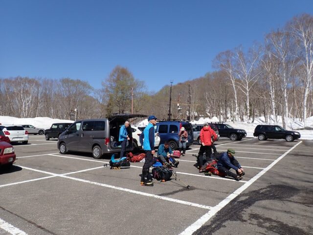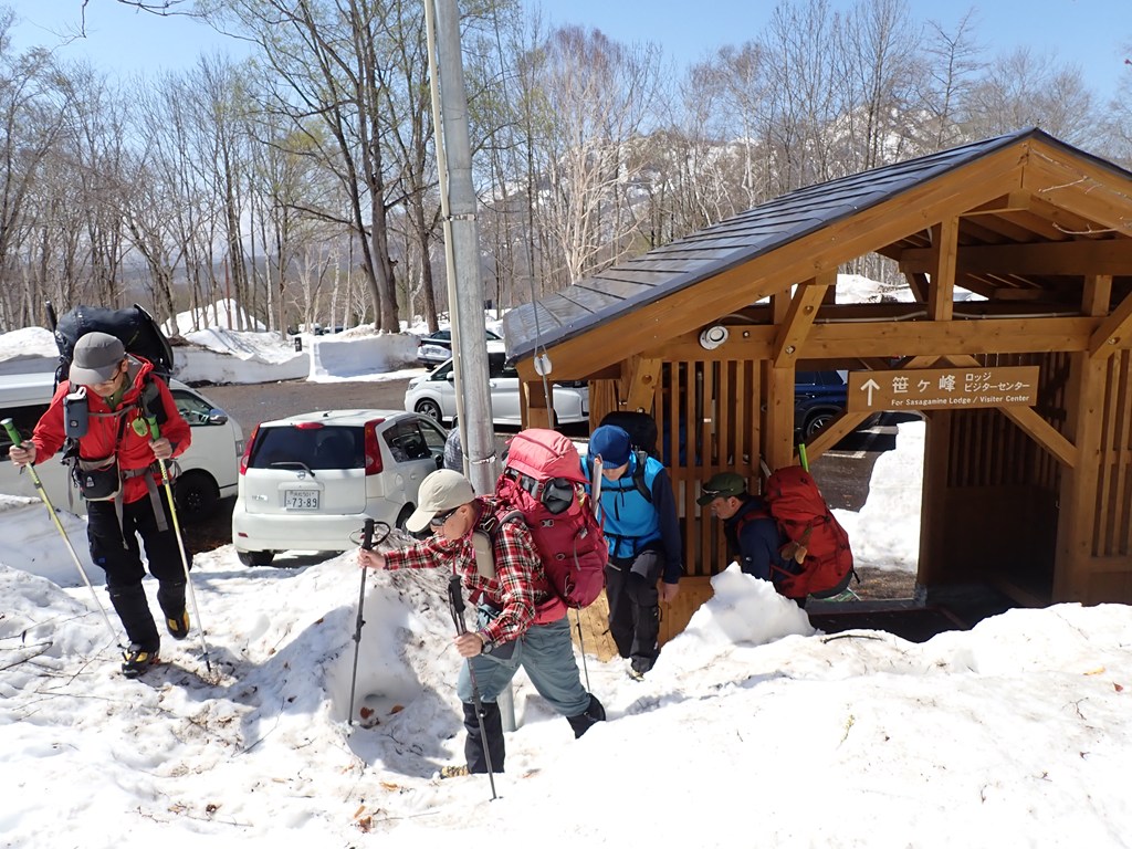 5時前に田沼に全員集合。そこで、ワカン、ヘルメットは必要ないだろうということになり、車に置いていきました。車2台に分かれて5時に出発。車は快調に進んだのですが、休憩しようとした横川SAは入口が渋滞しており、入るのを断念。佐久平が最初の休憩となりました。信濃町ICで下りて、県道39号線に入ると急カーブを繰り返しながら標高を上げていきます。道端に採り頃のフキノトウがたくさん見えました。9時前には笹ヶ峰に着きました。登山口前は満車だったのですが、すぐ先のキャンプ場の駐車場はまだたくさん空いていました。駐車場の周りにはまだ1m弱の積雪がありましたが、雪解けはどんどん進んでいました。