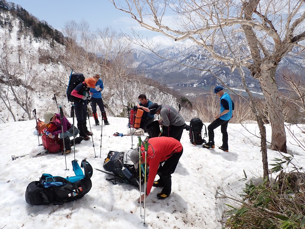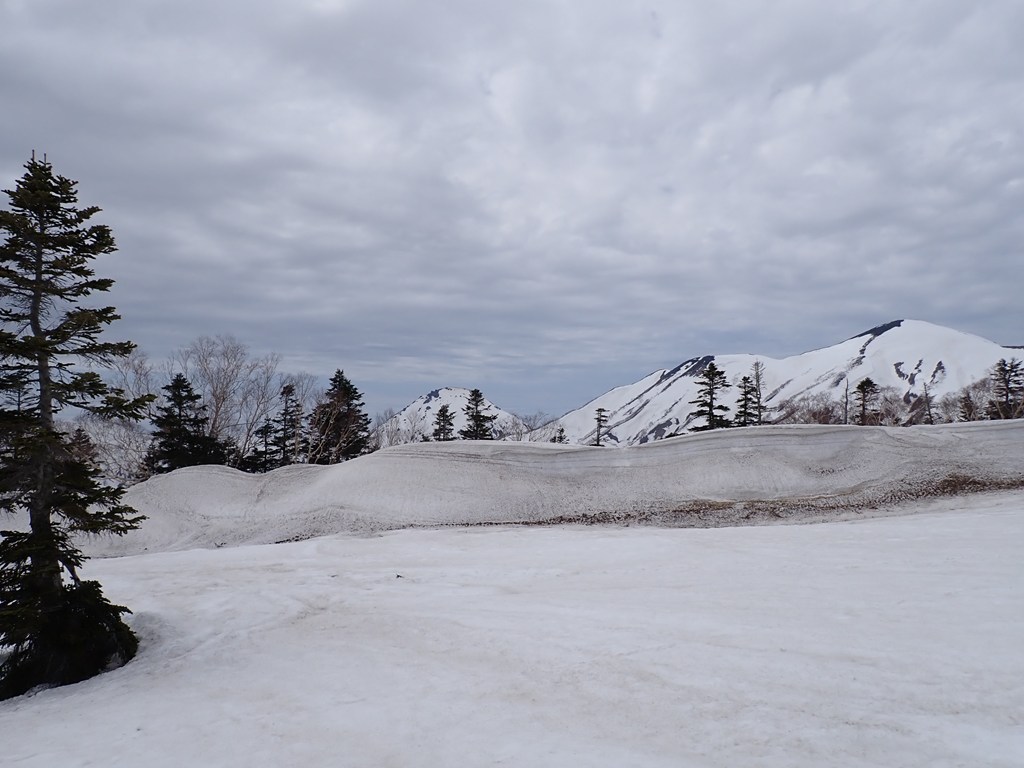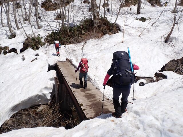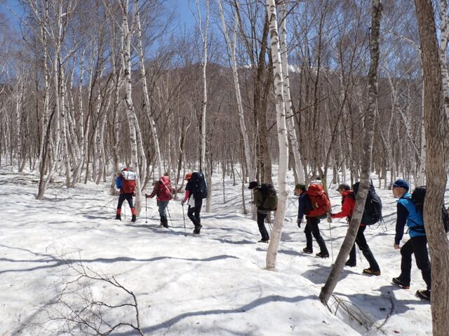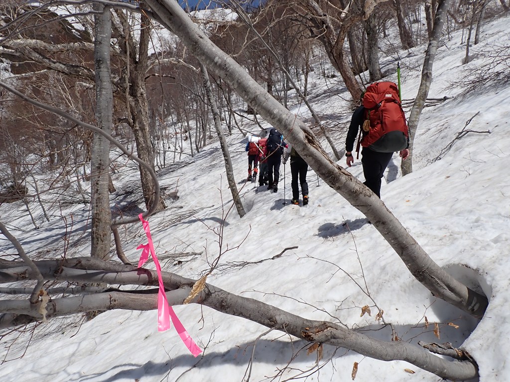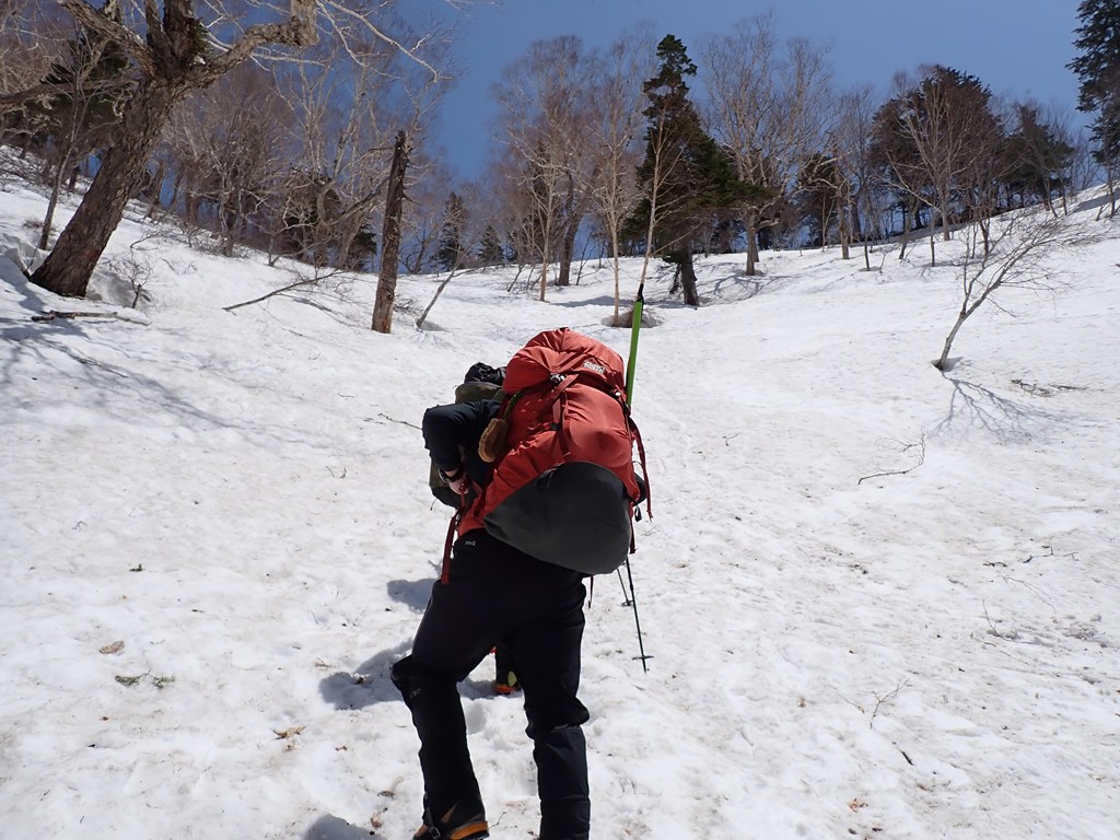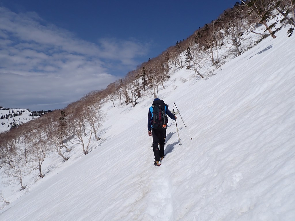 私は夏でも急傾斜のトラバースは大嫌いで、多少疲れても尾根を忠実に歩きたいと思うのです。まして、雪斜面のトラバースなど御免被りたい。おまけに雪崩も怖い。狭い踏跡を外さないように、バランスを崩さないようにストックを持つ手に力が入りましたが、約15分でトラバースは終了しました。雪崩の形跡もありませんでした。