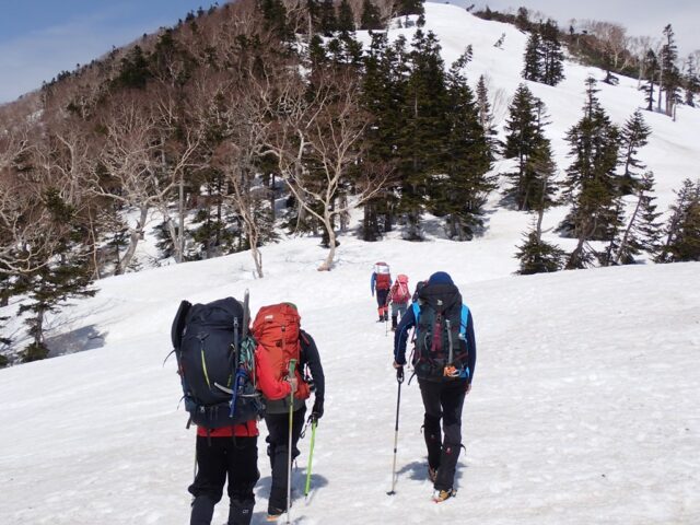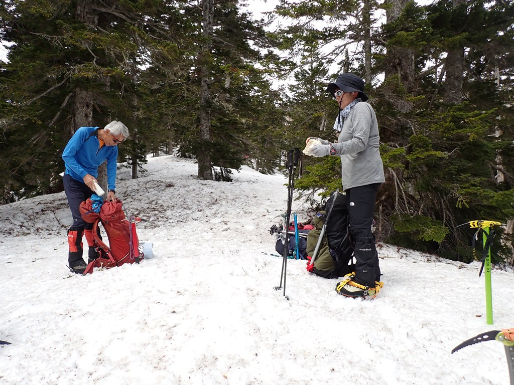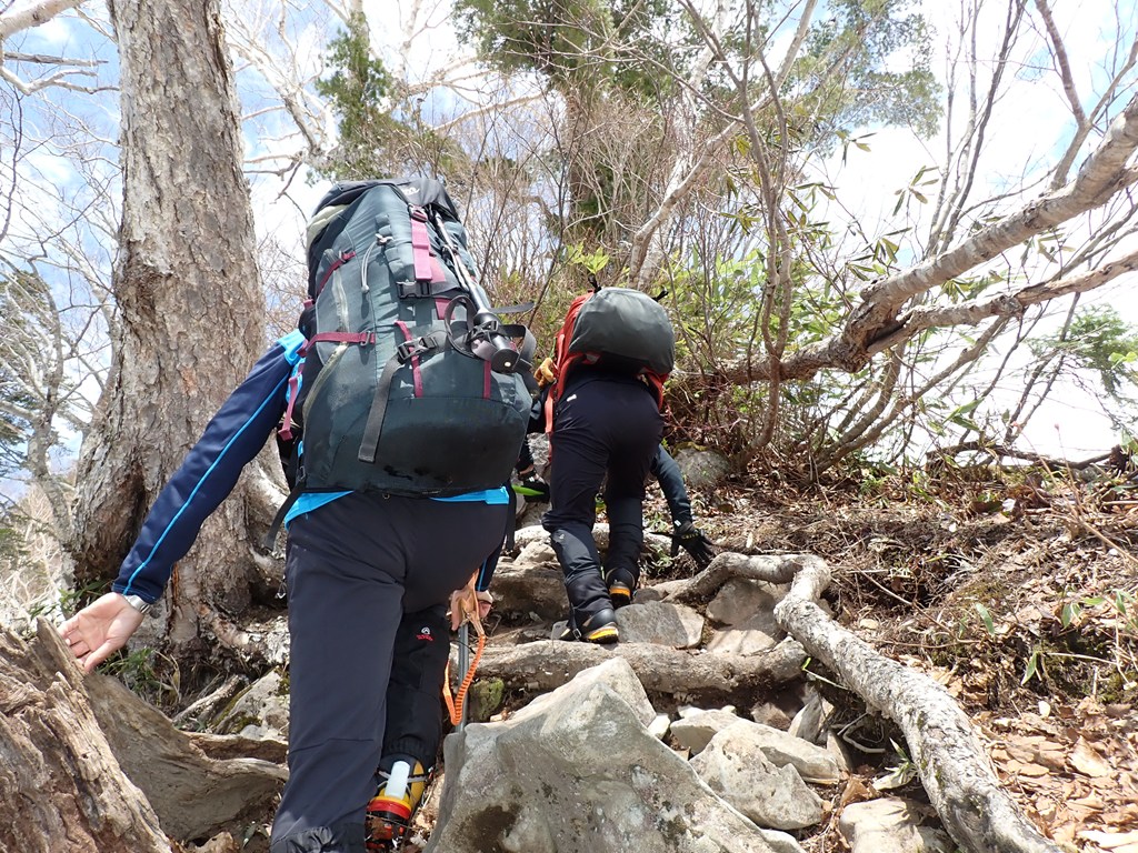 そこからもしばらく急騰が続くのですが、右側は黒沢への急斜面なので夏道を上りました。夏道は雪が少なく岩の多い急な上りで、所々に踏み抜きしそうな所や凍結場所もあるので厄介です。