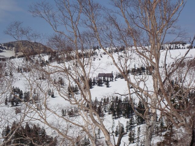 雪崩の形跡も見ませんでした。それ程案ずることは無かったようです。高谷池ヒュッテまで、夏道は少し大きく回り込むようですが、今の季節は雪上を直進できました。