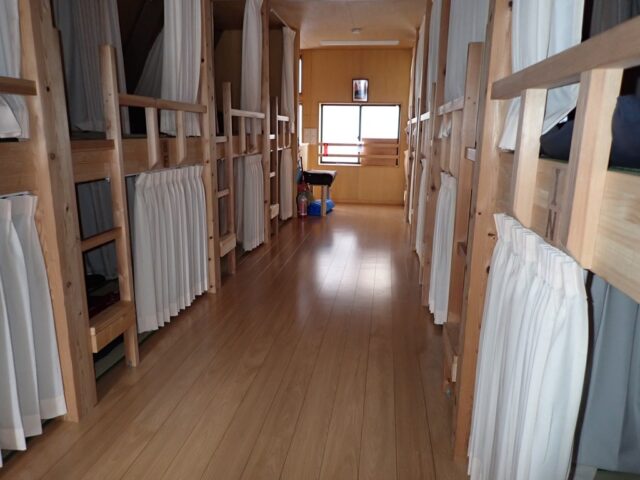 小屋泊は仮営業期間なので素泊まりのみで5000円、テント泊は1000円でした。私たち5人は素泊まり組で、案内された新館の2階は2段になっていて、片側の下の段を割り当てられました。一人当たり2畳近い広さで、奥には棚があり、カーテンで仕切ることもできます。かつての山小屋のギュウギュウ詰めからすると信じられない程快適です。