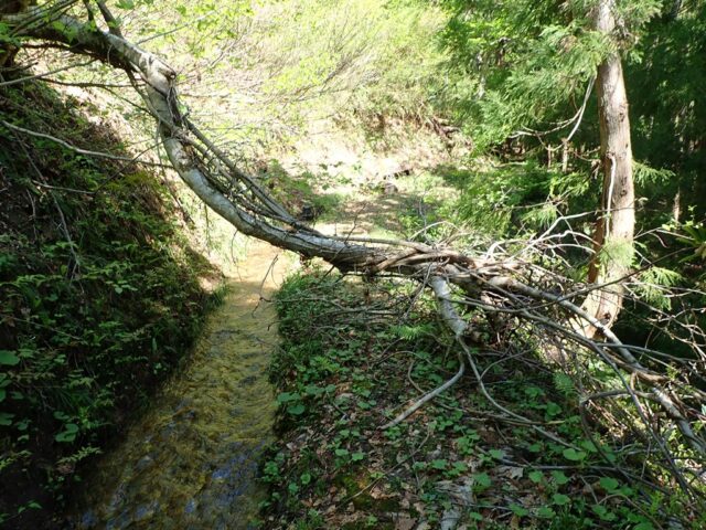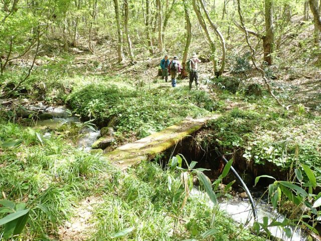 そこからは水路の脇道を進みます。水路の土手のような場所なので、大人数で歩くと崩れそうな所もありました。倒木を跨ぎます。