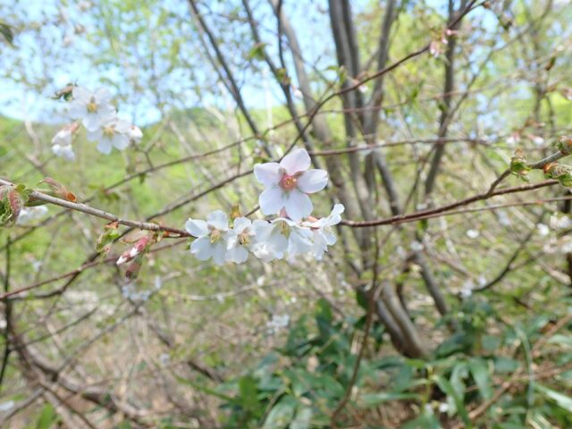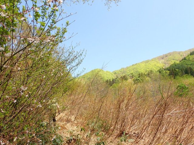 その上の伐採地は「わらび平」ともいうそうですが、まだワラビは芽吹いていませんでした。山桜は咲いていましたが、クロモジの花はまだでした。