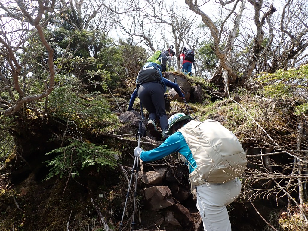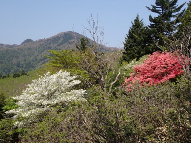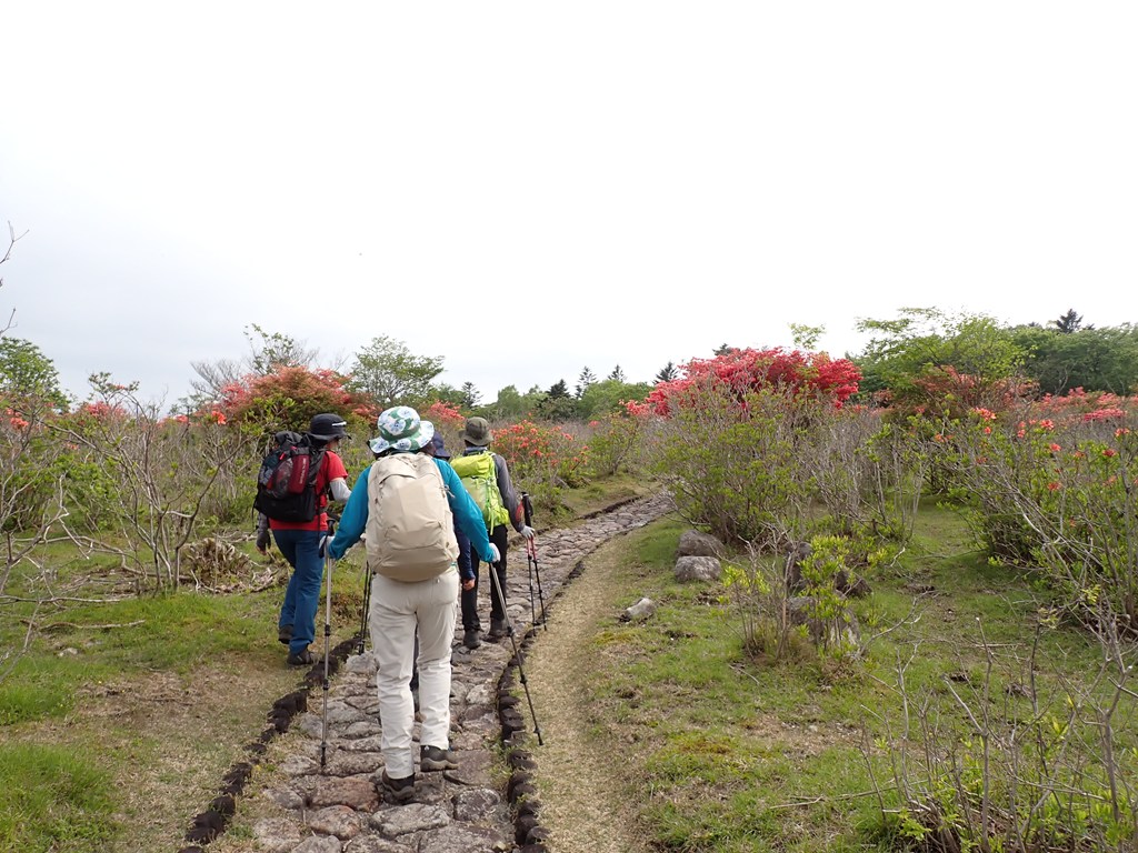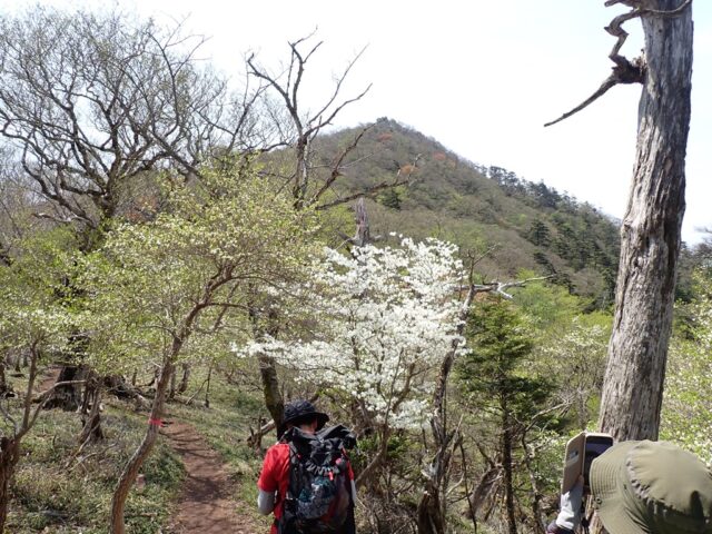 剣ヶ峰からの下りはかつては背丈ほどの笹が茂っていた筈なのですが、今はすべて枯れてしまっていました。まだ再生の気配も見えません。大入道が近づくとシロヤシオは花の勢いを失せていきました。