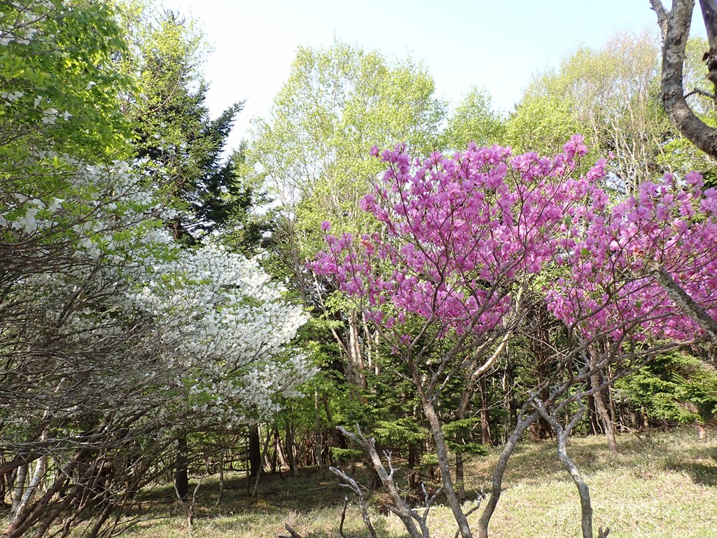 10分少々進んでから右の山道に入って八海山神社跡へ向かいます。傾斜が少しゆるむとシロヤシオが増えてきました。釈迦ヶ岳をバックにシロヤシオとヤマツツジが咲き誇っていました。