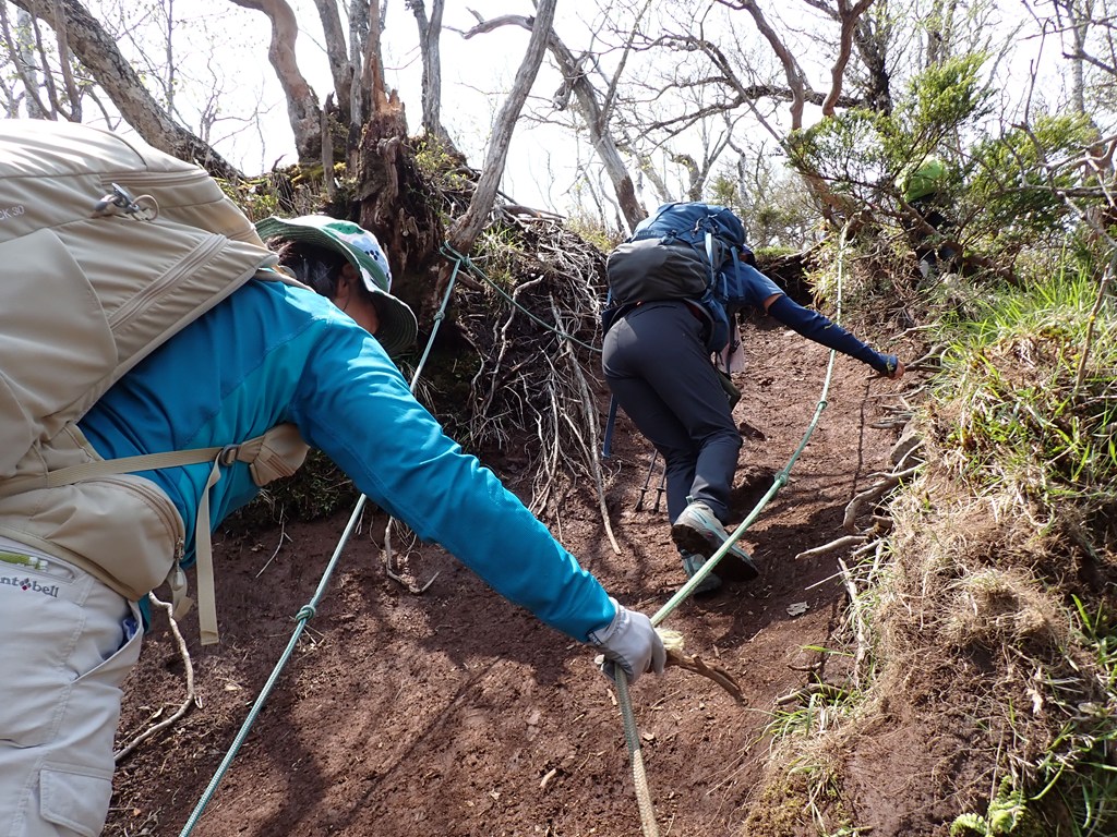 ここの急登は、赤土の滑りやすい場所が多いのですが、ロープが張られていて助かります。