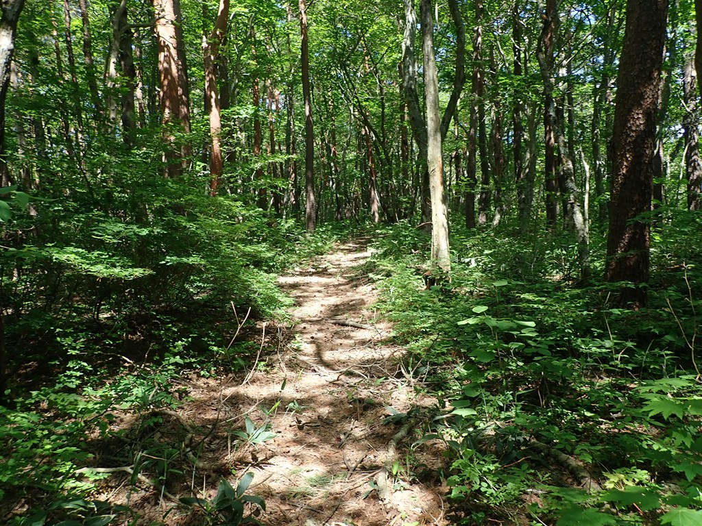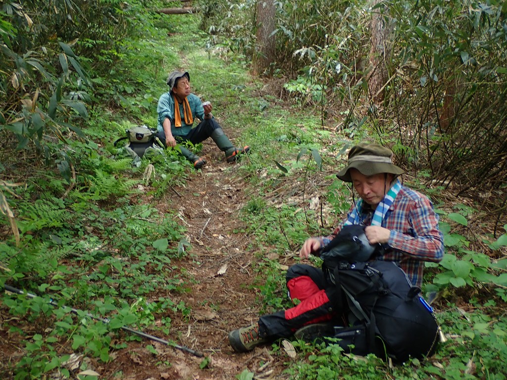 途中、使われていない林道にでます。林道を少し左に進んで改めて尾根に取りつきます。踏跡は見られませんが藪は薄くルートファインディングは簡単で、久しぶりに気楽な藪漕ぎを楽しむことができました。