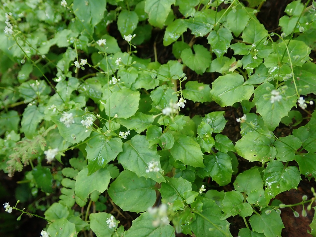 ミヤマタニタデ 白系 2023.08.252023.08.27 (アカバナ科)(花色:白色)(季節)7-8月(特徴)草丈5~20cmの多年草。茎は無毛か細毛を散生する。 葉は対生し、三角状広卵形で長さ1~4cm、幅0.7~3cm。縁には波状の鋭鋸歯があり、基部は浅心形。 花は10cm程度の花茎に総状につき、花弁は2弁、白色で径3mm。萼片は帯紅色で花弁より長い。 北海道~九州 深山や高山の林下 2023.8.10 幌尻岳