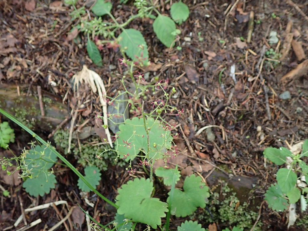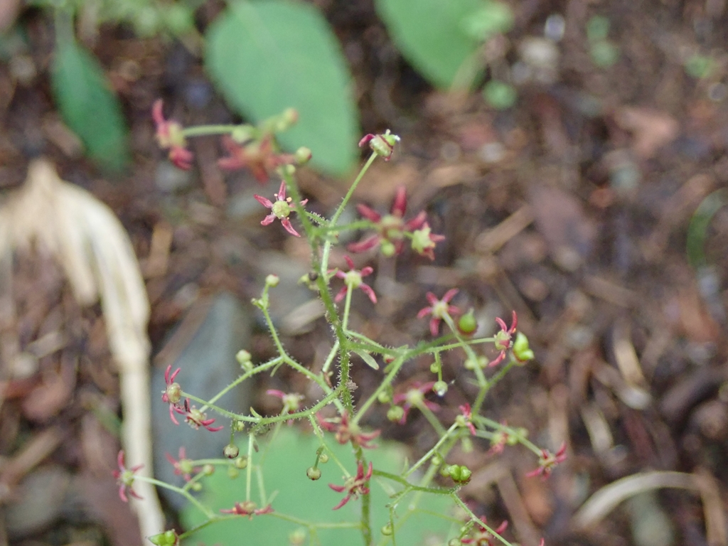 花は花茎の上部に大きな円錐花序となり、疎らに小さな花を多数つける。花柄は長さ15mm程度になり、花序や花柄に腺毛がある。花弁は5個、暗紫色~緑褐色、長卵形で、長さ約3mm、花時にはほぼ平開する。萼裂片は卵状三角形、多くは花時に著しく反曲する。雄しべは10個、裂開前の約は橙色。