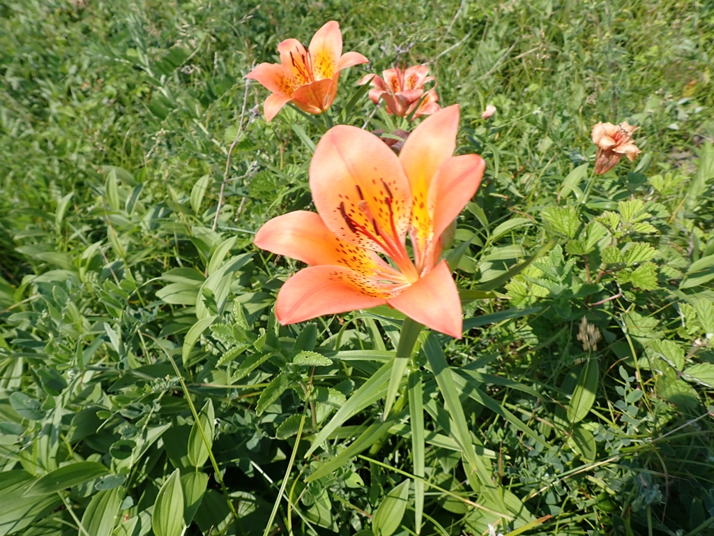 エゾスカシユリ 赤系 2024.07.15 (ユリ科)(花色:橙色)(季節)(特徴)北海道の海岸草地や山地の岩場などに生える多年草。ユリは横向きに咲くものが多いが、エゾスカシユリは上向きに咲く。草丈は30~60センチぐらい。花色は主に橙色で、鮮やかな花びらの内側に濃橙色のそばかすのような斑点がある。花びらの付け根が細くなって隙間があり、その隙間からオシベが見える、つまり透かして見えるので、この名が付いている。 2024.06.29 小清水原生花園