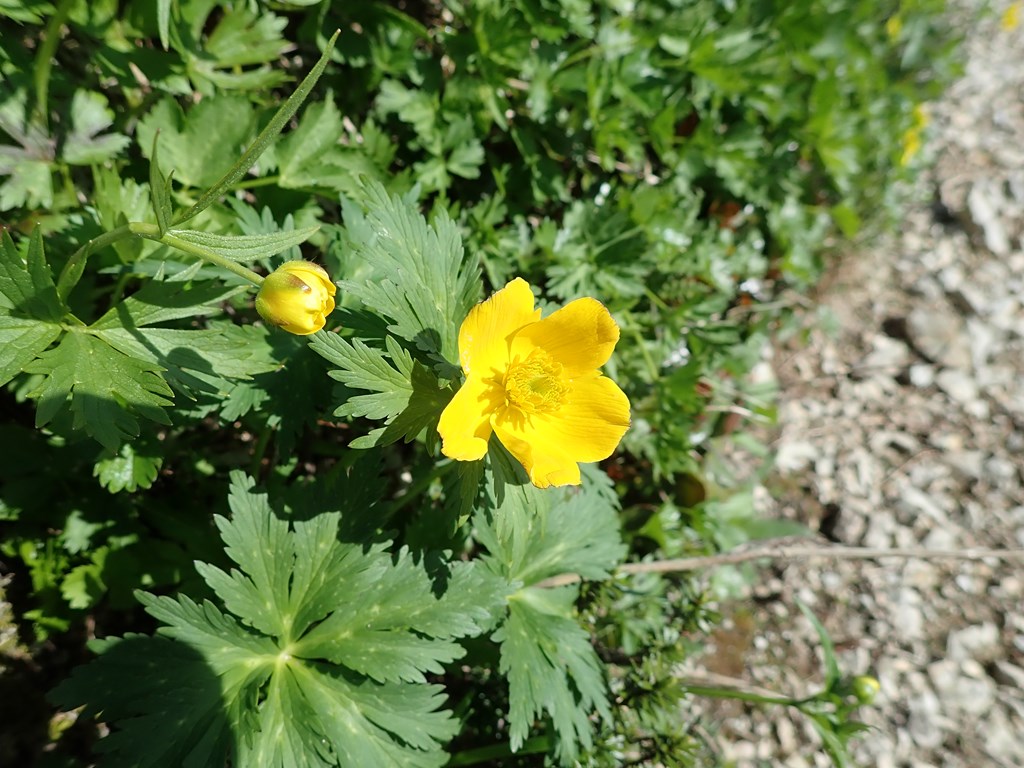 | タカネキンポウゲ | 直径2cm。萼片の外側に黒褐色の毛。 | 根生葉は単葉で扇形で先が少し丸く3-9裂する。 | キンポウゲ科。7-8月。 白馬山系 |