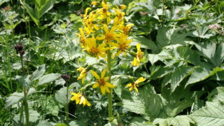 黄系 オタカラコウ (キク科)(花色:黄色)(季節)7-10月。(特徴)舌状花が5-9枚。葉は腎円けい。メタカラコウ:舌状花が1-4枚。葉は三角形の心形。カイタラコウ:舌状花が5枚。葉は角ばった心形。2019.08.06 朝日岳2019.08.06 朝日岳 2024.08.23 黄系