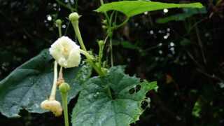 白系 カラスウリ (ウリ科)(花色:白色)(季節)7-9月に夜にレース状になった花が咲く。下の写真はそれがしぼんだもの。秋に赤い実を付ける(特徴)低地。ツル性2024.08.19 太平山2024.08.19 太平山 2024.08.21 白系